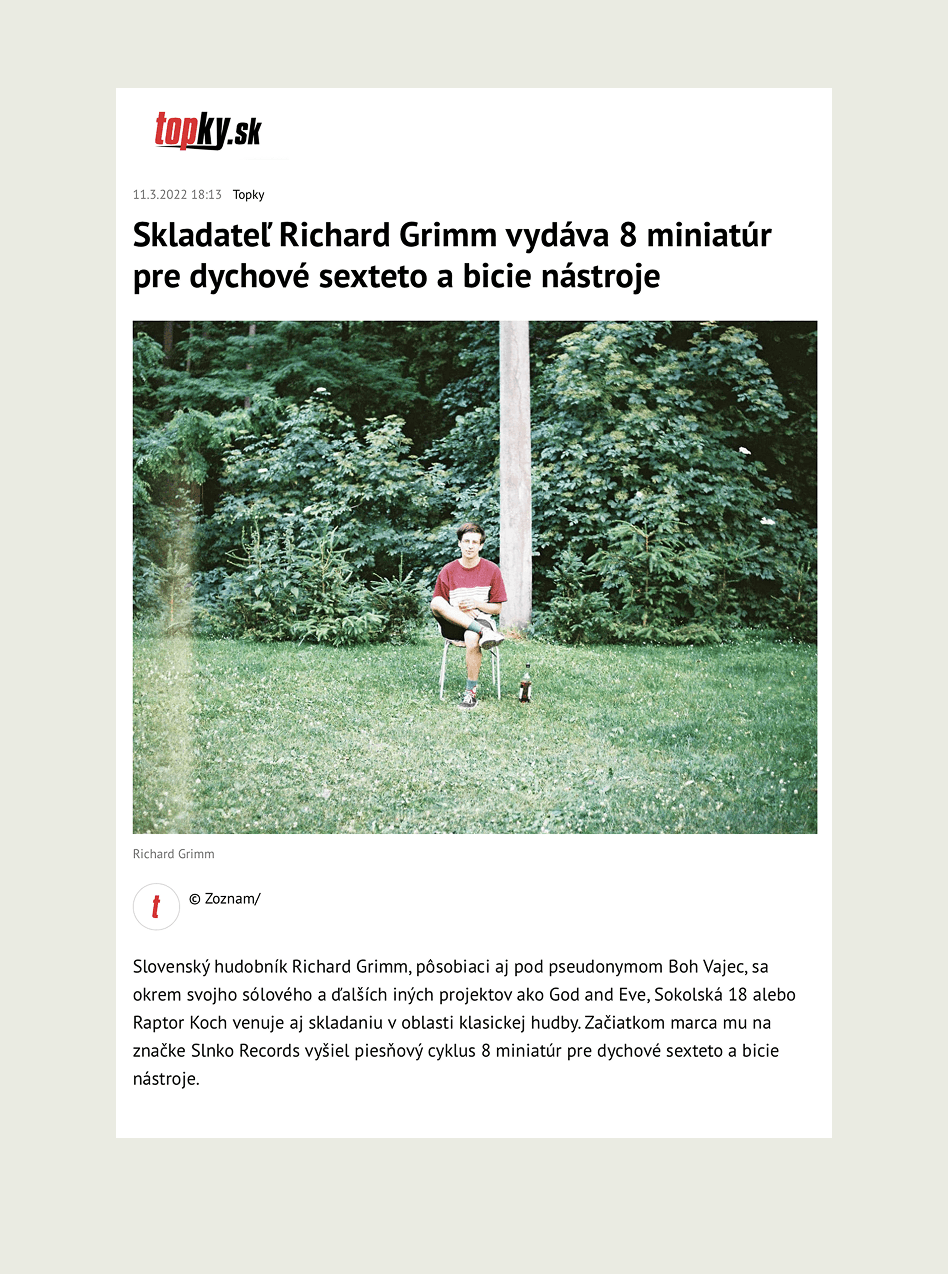 Pod záštitou občianskeho združenia Dobrý deň sme vyprodukovali hudobný album 8 miniatúr od hudobného skladateľa Richarda Grimma. Album je jedinečný nielen svojou hudobnou genialitou a profesionálnym prevedením pri nahrávke od zahraničných umelcov ale aj tým že je prvým historickým vydaním klasickej hudby pod celoslovensky známy hudobným vydavateľstvom Slnko Records.